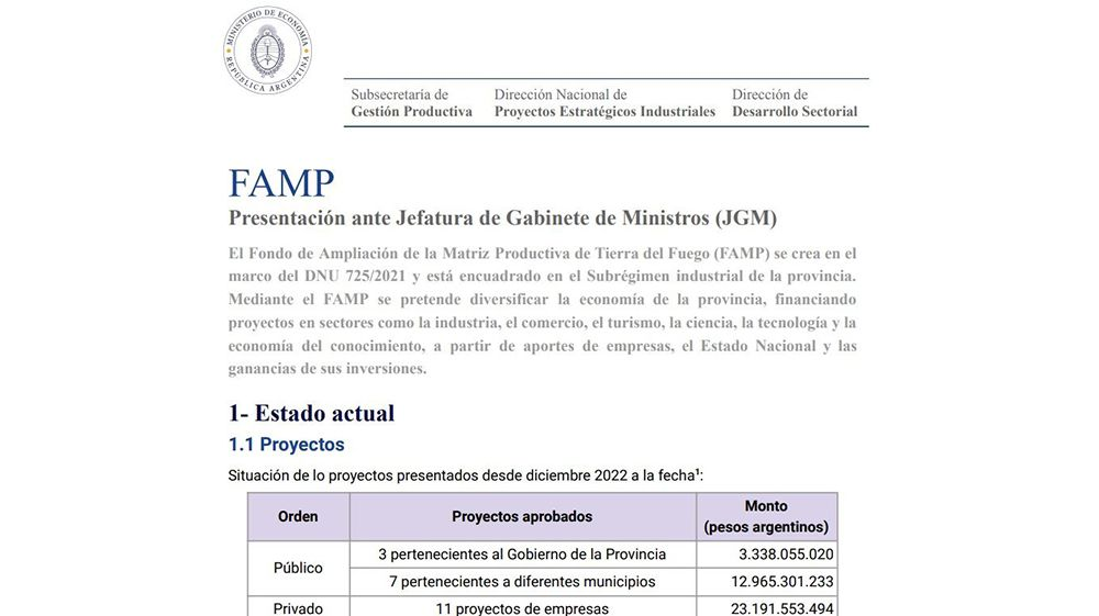 El informe oficial indica que desde fines de 2022 a la fecha fueron presentados para ser financiados por el FAMP 41 proyectos por un total de algo más de 125 mil millones de pesos. De ese total 21 proyectos, por casi 40 mil millones, fueron aprobados; 6 fueron rechazados y los 14 restantes están en trámite.