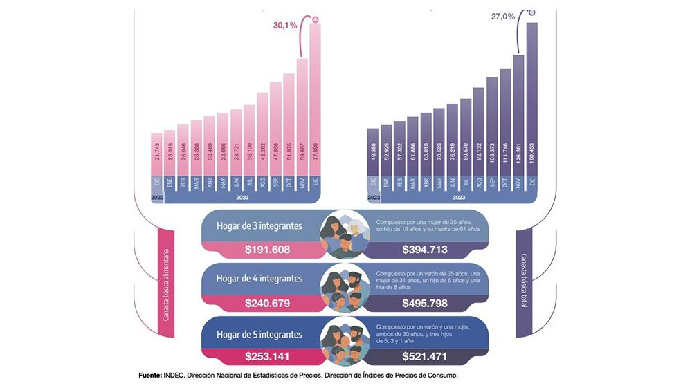 La canasta básica total, que mide la pobreza, aumentó 27% y una familia tipo necesitó en diciembre casi medio millón de pesos por mes para no ser pobre. En tanto, la canasta que mide la indigencia aumentó 30,1% y acumuló 258,2% en 2023