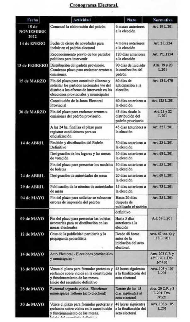 Por otra parte el cronograma electoral dictado ayer alcanza a los cargos provinciales y del Municipio de Tolhuin.