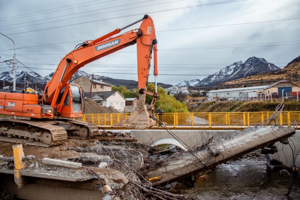 La secretaria de Planificación e Inversión Pública de la Municipalidad de Ushuaia, Gabriela Muñiz Siccardi, detalló que “en una primera instancia se demolieron las barandas, luego se continuó con la carpeta de rodamiento y se siguió con las losas y las vigas”, mientras que en la jornada del martes “se llevó adelante la demolición de los apoyos y los cabezales”.