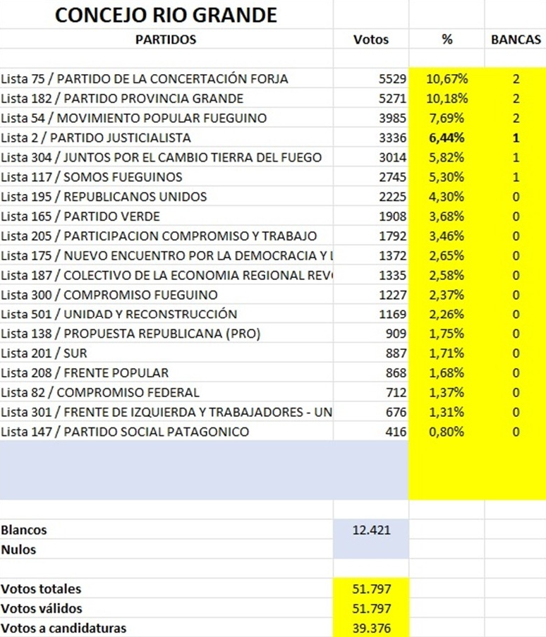 Con el escrutinio provisorio prácticamente definido y a la espera de la oficialización de los datos por parte de la Justicia Electoral, ya se conoce la futura composición del Concejo Deliberante de Río Grande.