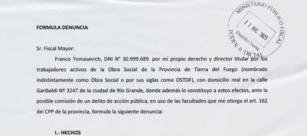 El vocal por el sector activo en OSEF, Franco Tomasevich, denunció ante el Fiscal Mayor de Río Grande al ex ministro de Desarrollo Humano de la provincia, Juan Marcelo Maciel, y a la actual presidenta de la Obra Social, Mariana Silvina Hruby. En la presentación, el vocal explica que, al tomar conocimiento sobre el estado financiero de la Obra Social, se advierte un fuerte contenido deficitario que impacta directamente en la calidad y posibilidades de las prestaciones médicas asistenciales a las que está obligada.