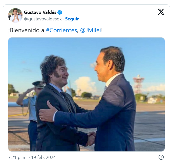 En el radicalismo siguen de cerca los movimientos del gobernador de Corrientes, Gustavo Valdés, quien esta tarde recibió en el aeropuerto de su ciudad capital a Javier Milei. Es el primer encuentro del Presidente con un mandatario provincial tras los fuertes contrapuntos que protagonizó con muchos de ellos por el fracaso de la ley ómnibus y la eliminación de trasferencias. Por eso, en el radicalismo refractario a las ideas del Gobierno miran de reojo al correntino, que suele ser un habilidoso equilibrista en las disputas de poder.