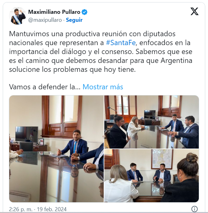 Cuando faltan poco más de dos semanas para la apertura de sesiones ordinarias, el Gobierno retoma el diálogo con los mandatarios provinciales, protagonistas indiscutidos durante la discusión del proyecto de “Ley de Bases”. En paralelo, el radical Maximiliano Pullaro (Santa Fe), quien adoptó una actitud combativa con la Casa Rosada, se mostró hoy con los diputados nacionales de su provincia y envió un mensaje claro al Gobierno libertario: “Vamos a defender la producción y el trabajo de Santa Fe”.
