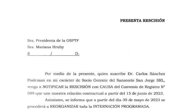 La decisión de la clínica de solicitar la rescisión con la OSEF responde, según se explican en la notificación de tres carillas, a la necesidad de garantizar su sustentabilidad y salvaguardar la calidad de los servicios médicos ofrecidos.