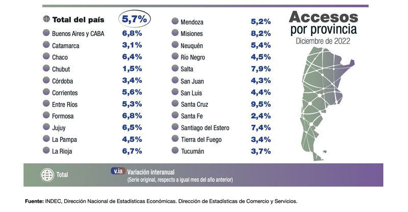 En diciembre de 2022, los accesos residenciales aumentaron 6,1% interanual. Las provincias que mostraron el mayor crecimiento interanual en cantidad de accesos residenciales fueron Santa Cruz (9,5%), Misiones (8,7%) y Salta (8,7%); mientras que no se registró ninguna baja.