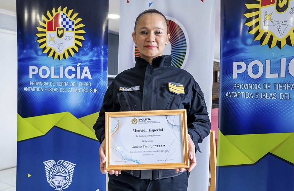 En un acto llevado adelante en la Jefatura de la Policía de la ciudad de Ushuaia; el viceministro de Coordinación de Gabinete, Jorge Canals, junto al Jefe de la Policía, Jacinto Rolón y el Comisario General Oscar Alfredo Barrios Kogan; reconocieron a la Sargento Susana Cuello por su acto destacado en servicio, quien junto a su compañero el Agente Thomas Girard contuvo a una persona que quería atentar contra su integridad física.