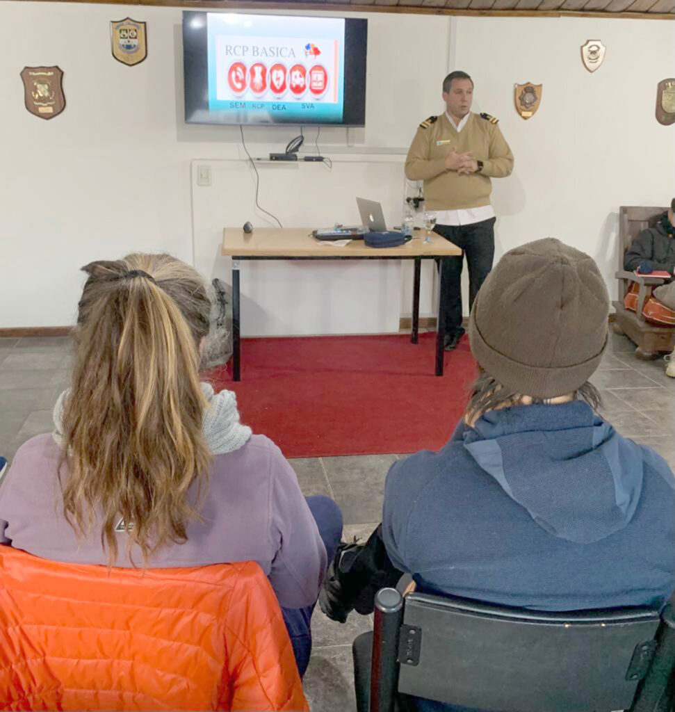 En un principio los alumnos fueron instruidos en Técnicas de Reanimación Cardio Pulmonar (RCP), utilizando el desfibrilador externo automático (DEA), que están a bordo de los buques de expedición antártica que operan desde este Puerto de Ushuaia con destino a la Península Antártica, Islas Georgias y las Islas Malvinas.