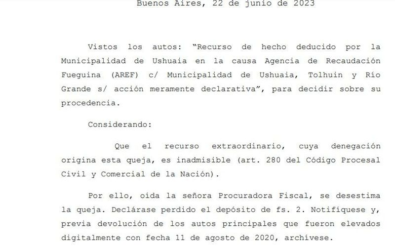 Agotada la vía judicial ante el máximo tribunal de la nación pierde vigencia la ley 1242 mediante la que la Legislatura dispuso, en septiembre de 2018, mantener la suspensión de la aplicación de la ley 1075, en lo referido al Impuesto Inmobiliario, “hasta que la Corte Suprema de Justicia de la Nación se expida respecto de los recursos de queja interpuestos contra la sentencia dictada por el Superior Tribunal de Justica de la Provincia en la causa “Agencia de Recaudación Fueguina (AREF) c/ Municipalidad de Ushuaia, Tolhuin y Río Grande s/ Acción Meramente Declarativa”.