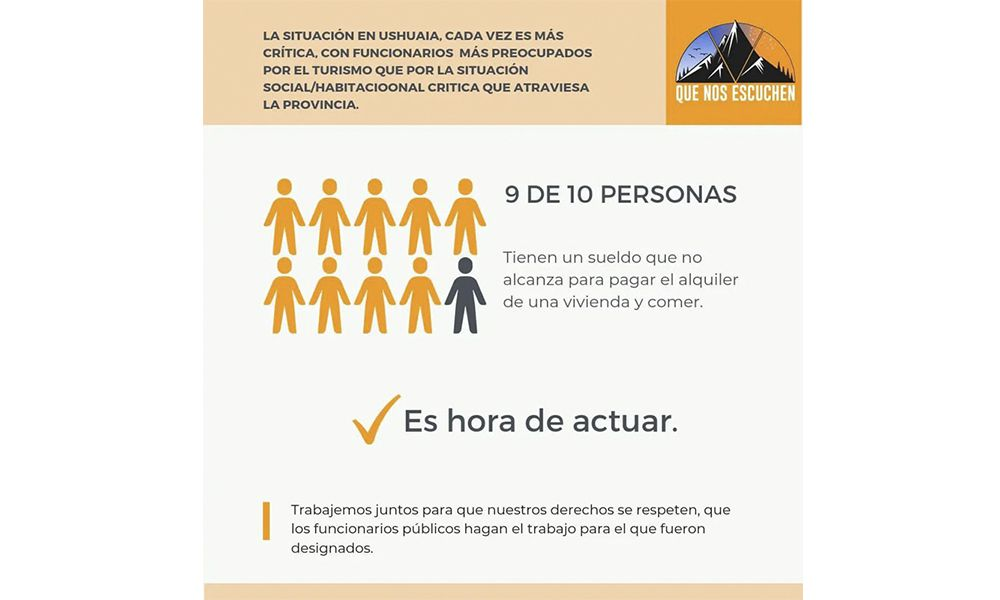 Otro dato relevante que aporta el informe que la agrupación de vecinos realizó en Ushuaia fue que «9 de cada 10 personas (relevadas) tiene un sueldo que no alcanza para pagar el alquiler de una vivienda y comer».
