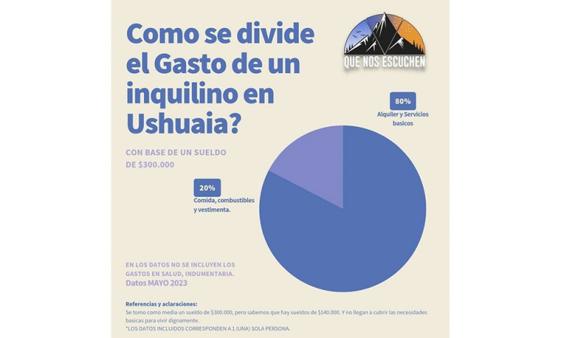 De acuerdo a un relevamiento realizado por la agrupación de vecinos «Que nos escuchen», en mayo de 2023 una persona que alquila en Ushuaia destinó el 80% de sus ingresos sólo para pagar la renta.