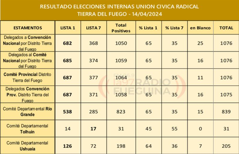 La lista 1 encabezada por el concejal riograndense, secundado por el senador Blanco, obtuvo una contundente victoria sobre la lista 7, que sólo obtuvo el Comité de Tolhuin. Todos los resultados.