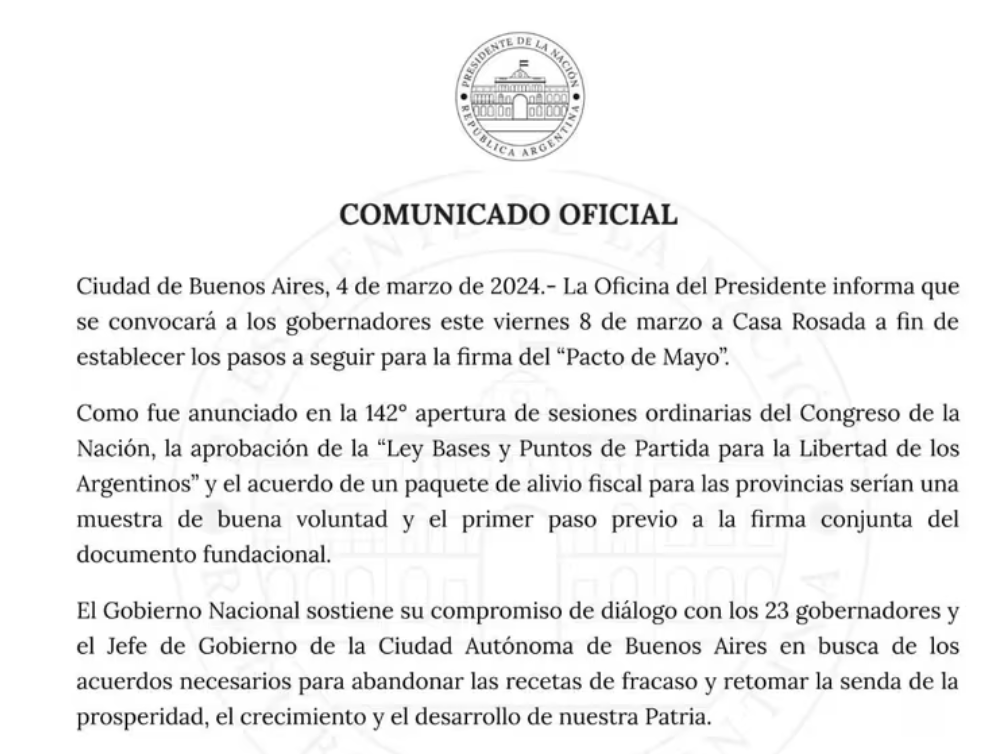 De esta manera, a través de un comunicado aseguraron que “El Gobierno Nacional sostiene su compromiso de diálogo con los 23 gobernadores y el Jefe de Gobierno de la Ciudad Autónoma de Buenos Aires en busca de los acuerdos necesarios para abandonar las recetas del fracaso y retomar la senda de la prosperidad, el crecimiento y el desarrollo de nuestra Patria”.