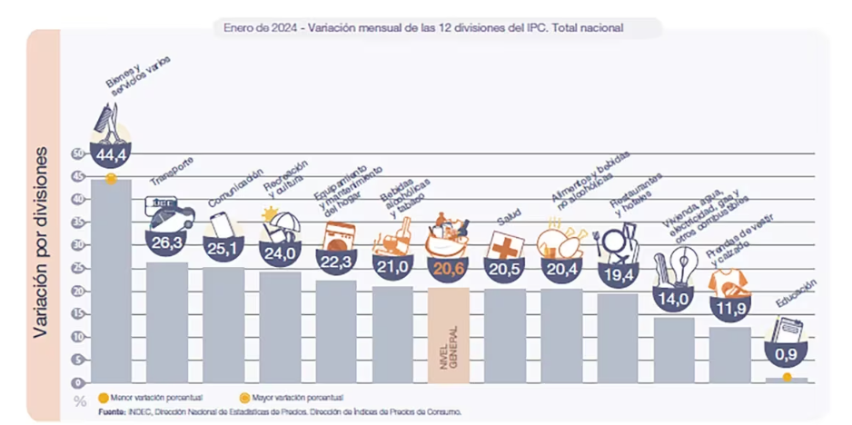 Según el relevamiento de C&T Asesores Económicos, la inflación del primer mes de 2024 fue de 19,6% y a nivel interanual, alcanzó el 242,2%. “El alza de los precios minoristas en enero estuvo liderada por esparcimiento, factor estacionalmente clave en todos los eneros, pero que este año tuvo una suba mayor, de 36,8%, debido al impacto del ajuste del tipo de cambio oficial y el alza general de precios”, indicó el informe.