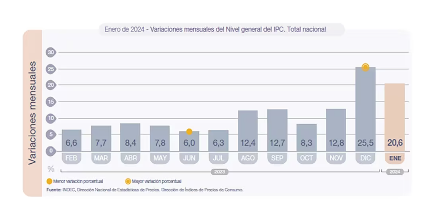 La inflación de enero fue de 20,6% y acumuló 254,2% durante el último año, según informó esta tarde el Instituto Nacional de Estadística y Censos (Indec). El dato mensual implicó una desaceleración respecto al 25,5% que había marcado diciembre, el más alto desde febrero de 1991, por el cual el 2023 había cerrado en 211,4 por ciento.