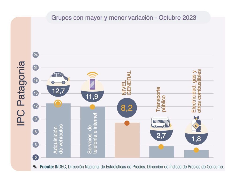 En octubre los grupos que superaron la variación del nivel general del IPC en la Patagonia fueron Adquisición de vehículos con el 12,4% y Servicios de telefonía e Internet con el 11,9%. En el otro extremo se ubicaron Transporte público con el 2,7%; y Electricidad, gas y otros combustibles con el 1,8%.
