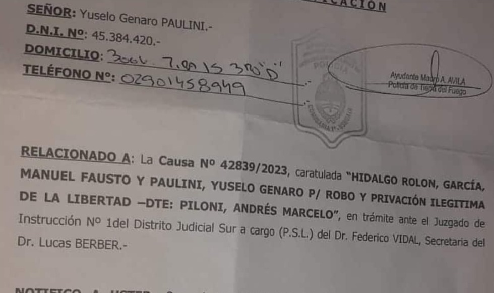 En la notificación policial, se aclara que se dejó sin efecto el llamado a indagatoria que había cursado en su momento el juez que interviene en la causa, el mismo que dispuso un allanamiento en el domicilio de la familia de Paulini.