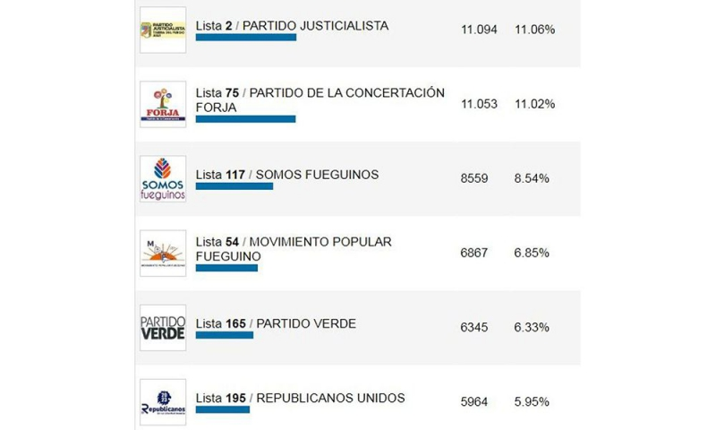 De acuerdo a los resultados del recuento provisorio de votos – que no se modificaría sustancialmente con el escrutinio definitivo ya que los votos recurridos e impugnados en la categoría Legisladores suman apenas 165 sufragios- a nivel provincial el PJ obtuvo 11.094 votos (11,06%); 11.053 FORJA (11,02%); 8.559 Somos Fueguinos (8,54%); 6.887 el MPF (6,85%) y 5.964 (5,955) Republicanos Unidos, en tanto hubo 25.380 votos en blanco (25,31%).