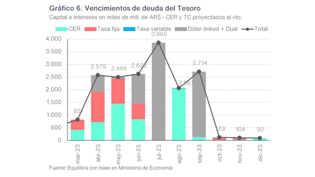 Las “torres” de vencimientos para los próximos meses ascienden a más de 12 billones de pesos entre marzo y julio y que asciende a 16 billones hasta octubre. De acuerdo a una estimación hecha por la consultora Equilibra, “si miramos el perfil de vencimientos dinámico (proyectando la evolución del CER y el tipo de cambio hasta el vencimiento de cada instrumento) deben pagarse más de 16 billones de pesos (10% del PBI) entre marzo y octubre”, estimaron.