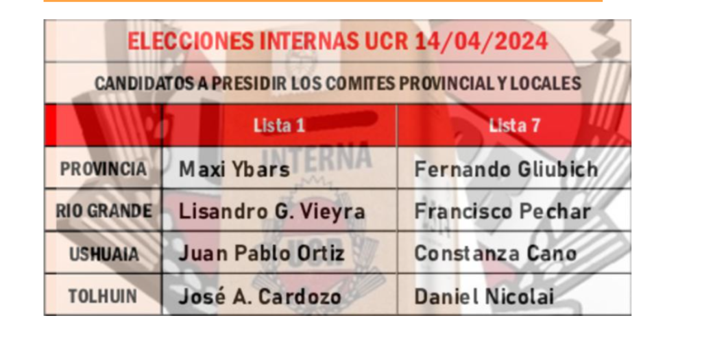 Juan Pablo Ortiz (Lista 1) y Constanza Cano (Lista 7) competirán por la presidencia del Comité Local Ushuaia, en tanto que en Tolhuin ocupará la presidencia del Comité Local José Antonio Cardozo (Lista 1) o Daniel Nicolai (Lista 7).