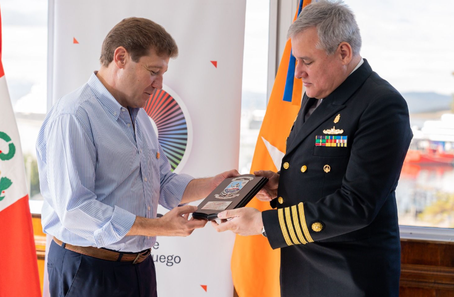 El gobernador de la provincia, Gustavo Melella, recibió al Capitán de Navío del buque oceanográfico polar de la Marina de Guerra de Perú, Diego Gago Rojas, en el marco de su arribo al puerto de la ciudad de Ushuaia, previo paso en el retorno a su país.