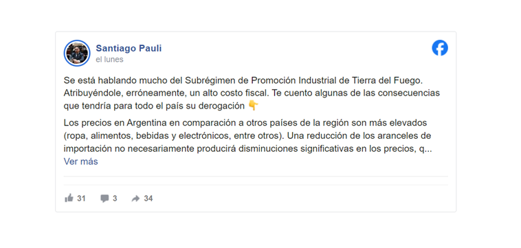 Pauli retrucó estas declaraciones a través de una extenso texto para “desmentir las atribuciones erróneas de un alto costo fiscal», y expuso algunas de las consecuencias que tendría para todo el país su derogación como “bajar los aranceles no implica que los costos bajen al nivel que te quieren hacer creer”.