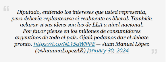 “Diputado, también debería aclarar si sus ideas son las de La Libertad Avanza a nivel nacional. Por favor piense en los millones de consumidores argentinos de todo el país. Ojalá podamos dar el debate pronto”, concluyó el parlamentario cercano a Elisa Carrió.