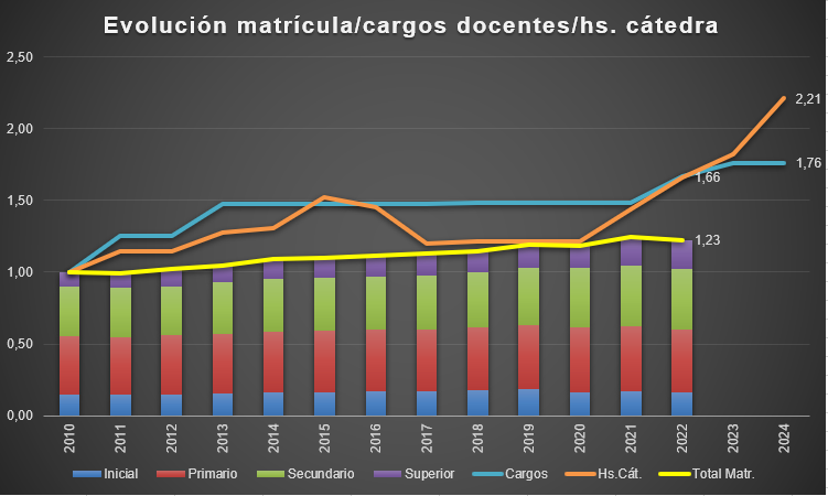 Tomando como base el año 2010, entre ese ejercicio y el 2022 la matrícula total del sector público aumentó un 23%, la cantidad de cargos docentes el 66% y las horas cátedras el 67%. Estos porcentajes se elevan al 76% para los cargos docentes y el 121% en las horas cátedra en el proyecto para el 2024.