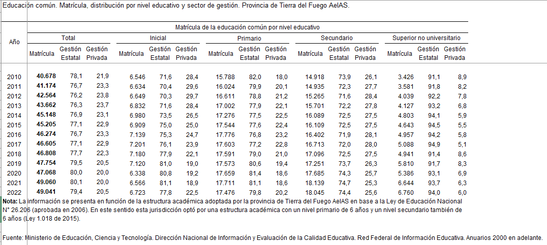De acuerdo con la información publicada por el IPIEC (Instituto provincial de análisis e investigación, estadísticas y censos) la cantidad de alumnos matriculados entre el año 2010 y el 2022 aumentó un 20% pasando de 40.678 a 49.041, incluyendo los establecimientos de gestión pública y gestión privada (no hay información sobre el 2023).