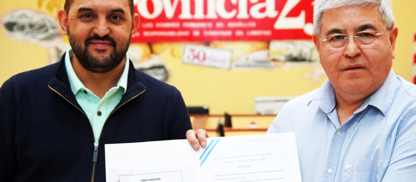 Río Grande.- El Legislador Federico Greve visitó las instalaciones del Diario Provincia 23 donde entregó una Declaración de Interés Provincial y Cultural a su director, Alberto Centurión, por su trayectoria al frente del diario y su compromiso con la comunidad a la hora de mantenerla informada.