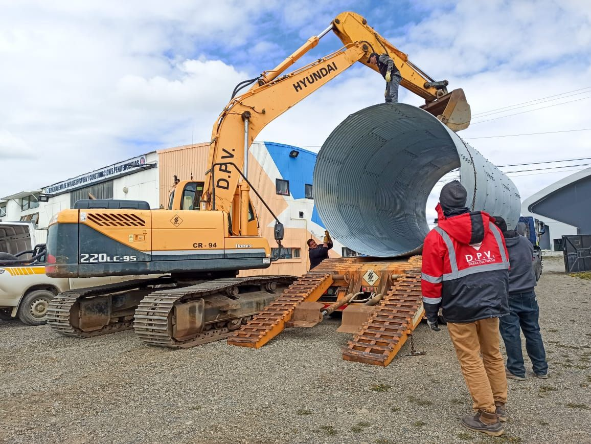La Dirección Provincial de Vialidad está llevando adelante el traslado de alcantarillas y material relacionados a la obra de construcción de un puente provisorio sobre el Río Radmussen, con el fin de reabrir el paso Fronterizo “Radman” sobre la Ruta Complementaria “B” que une a Chile y Argentina. Este nuevo puente provisorio cuenta con seis alcantarillas de metal corrugados de 3 metros de diámetro.