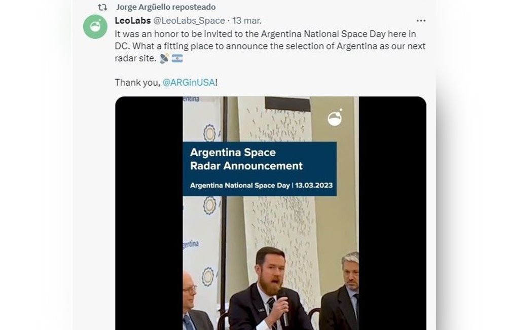 El legislador también mencionó un retweet del embajador a la empresa LeoLabs en el que la misma anunció la instalación de radar en Tierra del Fuego.