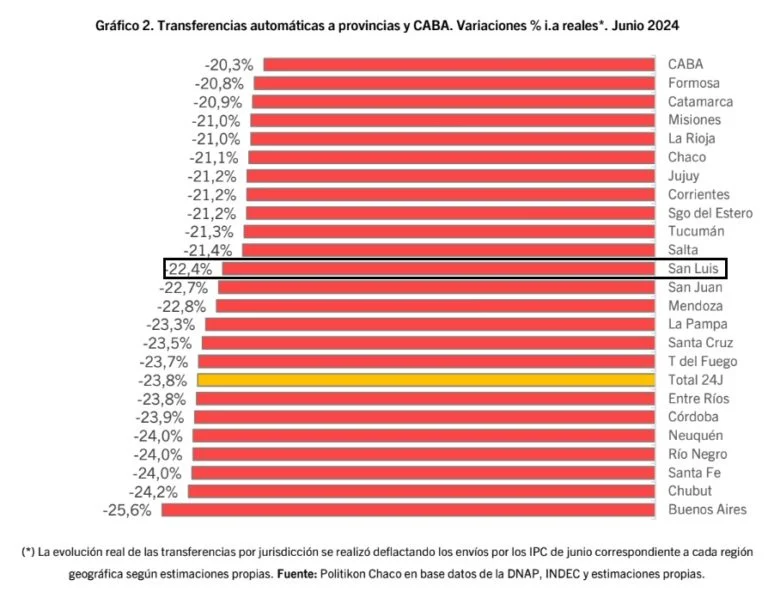 De esta manera, en el acumulado del primer semestre del año 2024 las transferencias automáticas giradas a las jurisdicciones provinciales registraron una disminución en términos reales superior al 10%.