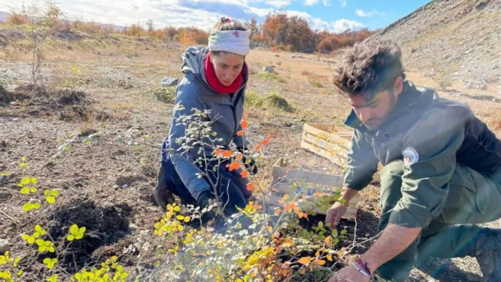 Para llevar a cabo la reforestación, los agentes remueven renovales de lenga del costado de la ruta de la Reserva y los trasladan hasta la zona de la ex cantera, donde se cavan pozos, se colocan los renovales y luego se los cubre para proteger las raíces.