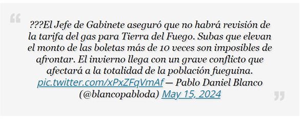 Blanco por su parte respondió públicamente a estas definiciones y manifestó que “el Jefe de Gabinete aseguró que no habrá revisión de la tarifa del gas para Tierra del Fuego, estas subas que elevan el monto de las boletas más de 10 veces son imposibles de afrontar”.