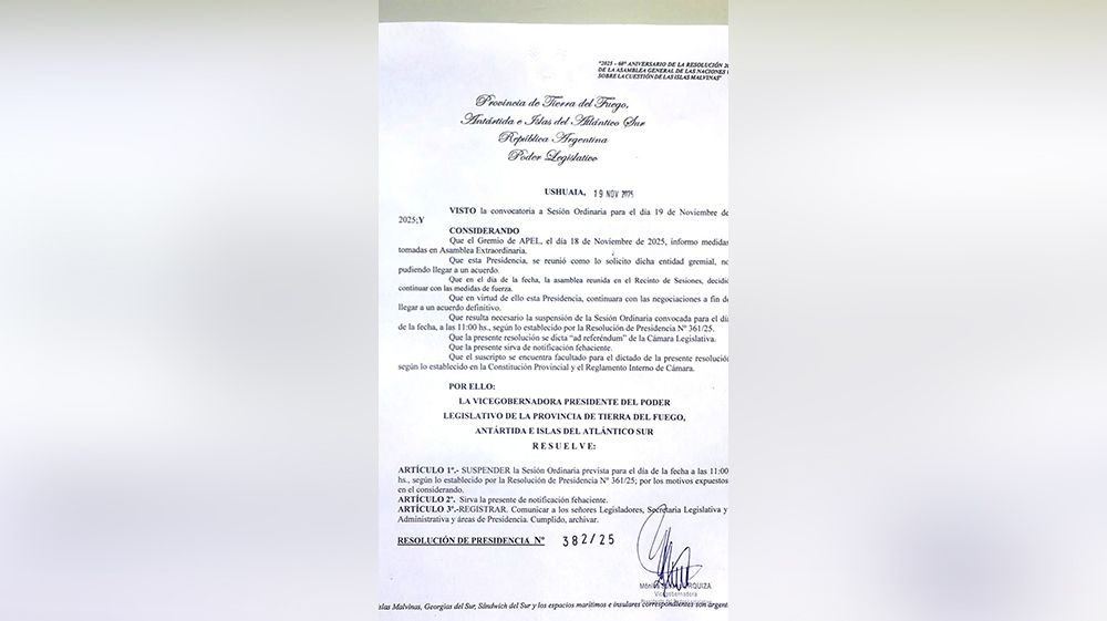La decisión tomada por la Presidenta de la Legislatura “ad reférendum” de la Cámara, dio por tierra con la posibilidad de que ayer se aprobará la el marco regulatorio para “el desarrollo sustentable de la acuicultura como actividad agropecuaria integral en aguas continentales y marítimas jurisdiccionales de la provincia” que venía a flexibilizar la prohibición “de toda actividad de cultivo y producción de salmónidos” en aguas jurisdiccionales lacustres y marítimas de Tierra del Fuego; como así con la designación por otro año más de Federico Greve (FORJA) y Victoria Vuoto (PJ) como miembros del Consejo de la Magistratura en representación de la Cámara Legislativa.