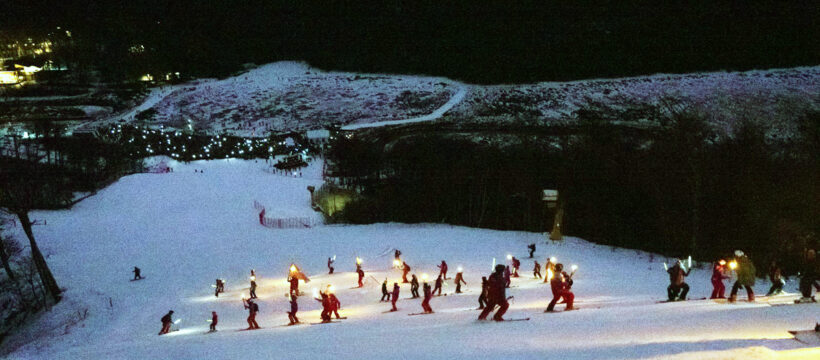 El momento más esperado comenzó pasadas las 18:00 con unos 80 esquiadores profesionales descendiendo por la pista Halcón Pelegrino hasta la base del complejo de esquí, ante la mirada de una multitud que los esperaba para presenciar juntos el encendido del pebetero y así brindar la bienvenida oficial al invierno y el inicio de temporada.