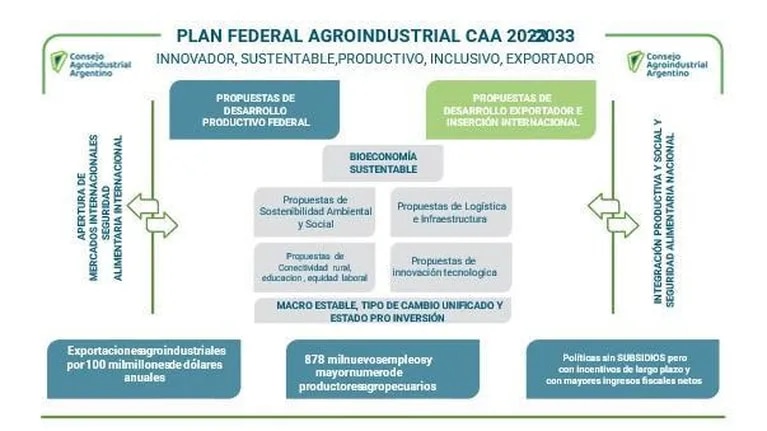 El Consejo Agroindustrial Argentino (CAA) lanzó este miércoles un plan agroindustrial con 40 propuestas a 10 años para alcanzar exportaciones por US$100.000 millones anuales y 870.000 nuevos puestos de trabajo. La iniciativa será acercada a todos los candidatos presidenciales que se presenten este año.