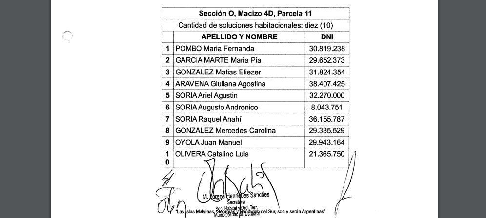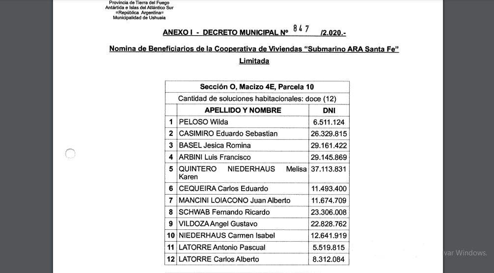 En tanto que el 08 de junio de 2020; la municipalidad de Ushuaia publicó, mediante Decreto Nº 847/2022, la nómina de personas adjudicatarias de ese plan, donde de esos 22 solo tres son veteranos; el propio Carlos Latorre, su hermano Antonio Latorre, Carlos Eduardo Cequeira y un cuarto, hijo de veterano; Luis Francisco Arbini.