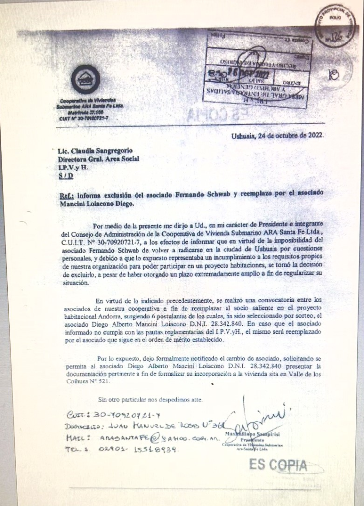 El fraudulento programa de vivienda, no hubiera salido a la luz si no fuera que el pasado 22 de agosto, la presidenta del Instituto de Vivienda y Urbanismo de Tierra del Fuego, Arq. Laura Malvina Montes; firmara a favor de Diego Alberto Mancini Loiacono, gerente de la empresa LeoLabs Argentina SRL, la transferencia bajo el formato de comodato, -un canon de uso no amortizable-, uno de esos dúplex que estaba a nombre de Schwab Fernando, cuyo cambio de titularidad los efectuó´el 24 de octubre de 2022, el actual presidente de la Cooperativa de Viviendas Submarino ARA Santa Fe Ltda Maximiliano Sampirisi.