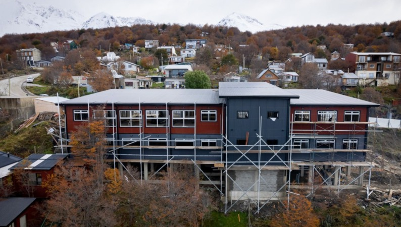 La obra de la nueva Escuela Provincial N°40 ‘María Elena Walsh’ se encuentra ubicada en el Barrio Ecológico de la ciudad de Ushuaia. Cuenta con un presupuesto de alrededor de $800 millones de pesos y es financiada con fondos del CAF, gestionados a través del Gobierno Nacional anterior junto a la Provincia.